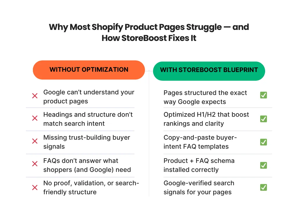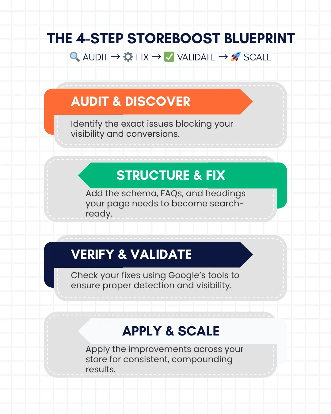 Your Blueprint is built to fix the real issues blocking your product pages from ranking and converting. Every component is personalized to your store — no generic templates, no overwhelming tutorials. Just clear, actionable steps you can implement right away.